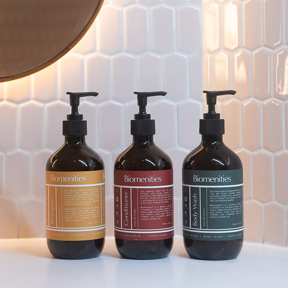 That's why we are committed to providing you with the most earth-friendly choices available: Our Zero Waste Collection has 100% biodegradable packaging, and our all natural Biomenities Range is in reusable and refillable bottles made from 100% recycled materials.